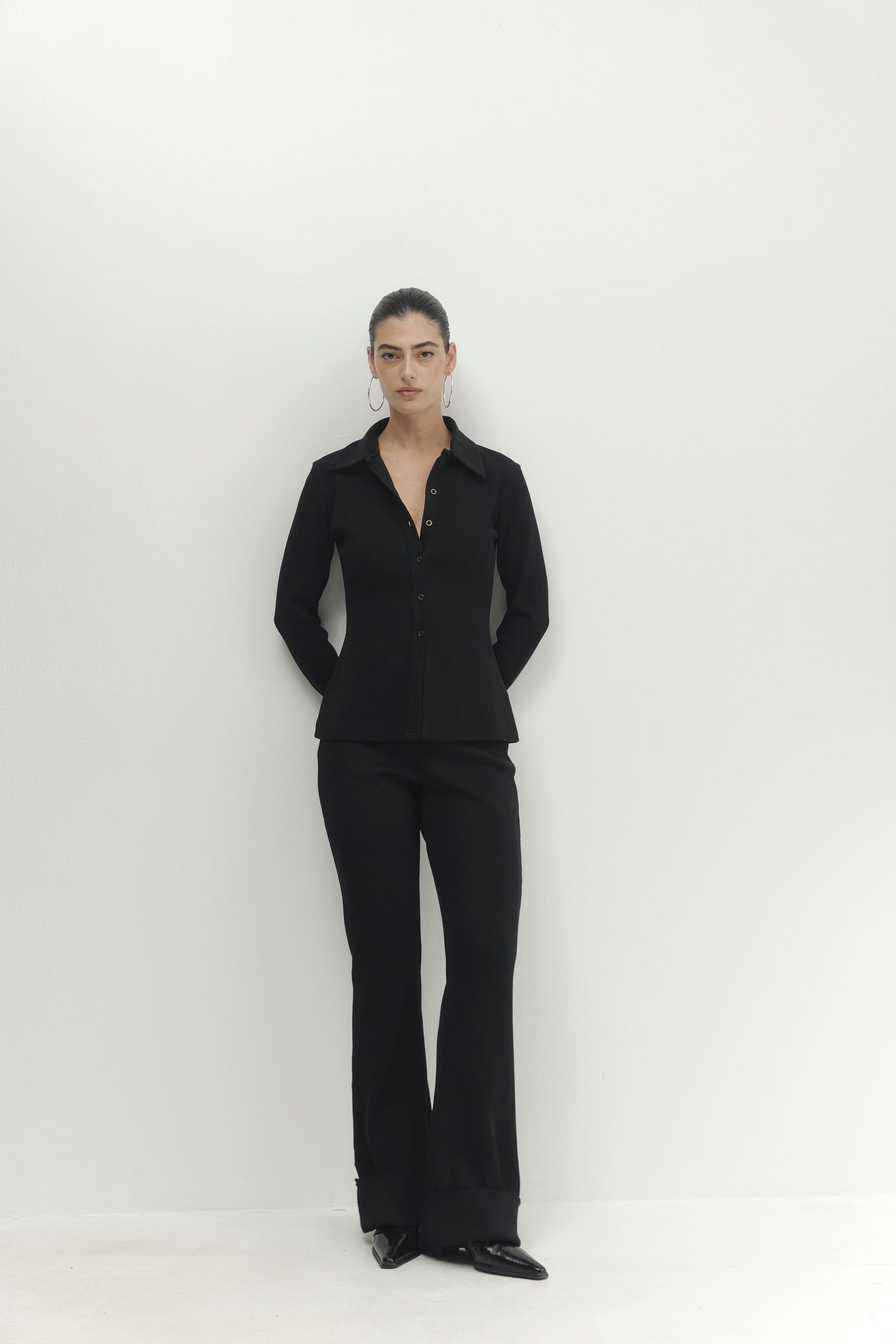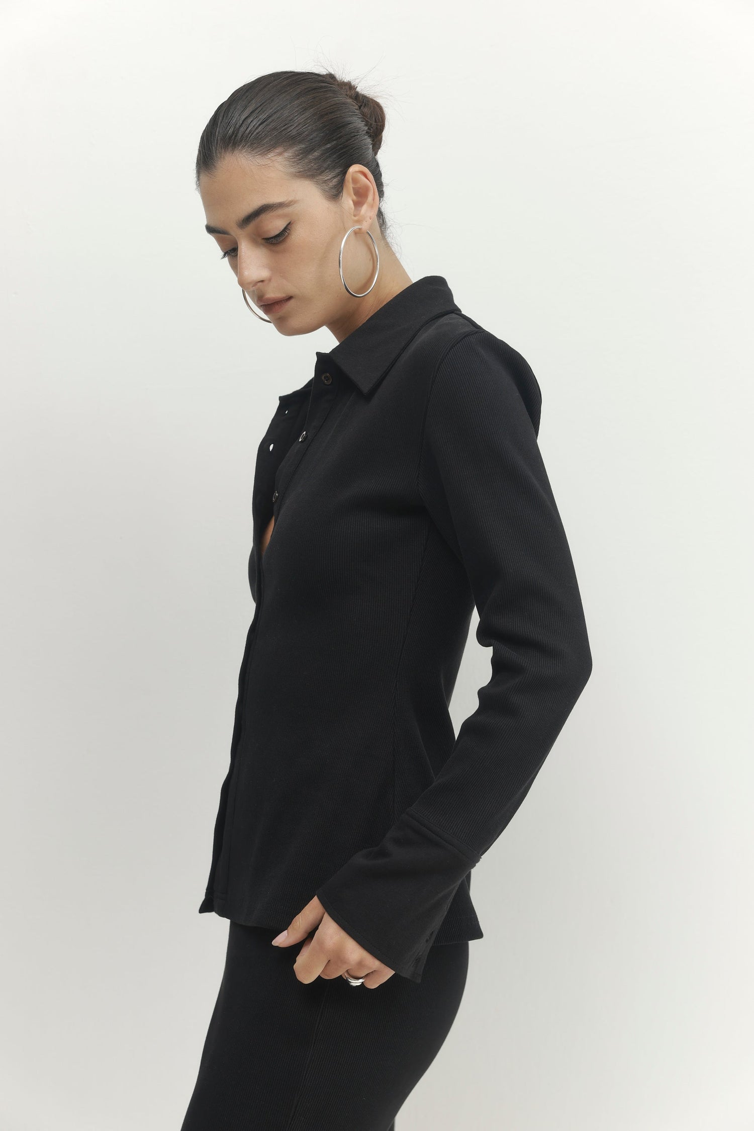 חולצה מכופתרת מבד ריב עבה ואיכותי, עם שרוולים ארוכים ודיטייל אלגנטי בחפתים- מומלץ לשלב עם המכנסיים התואמים.