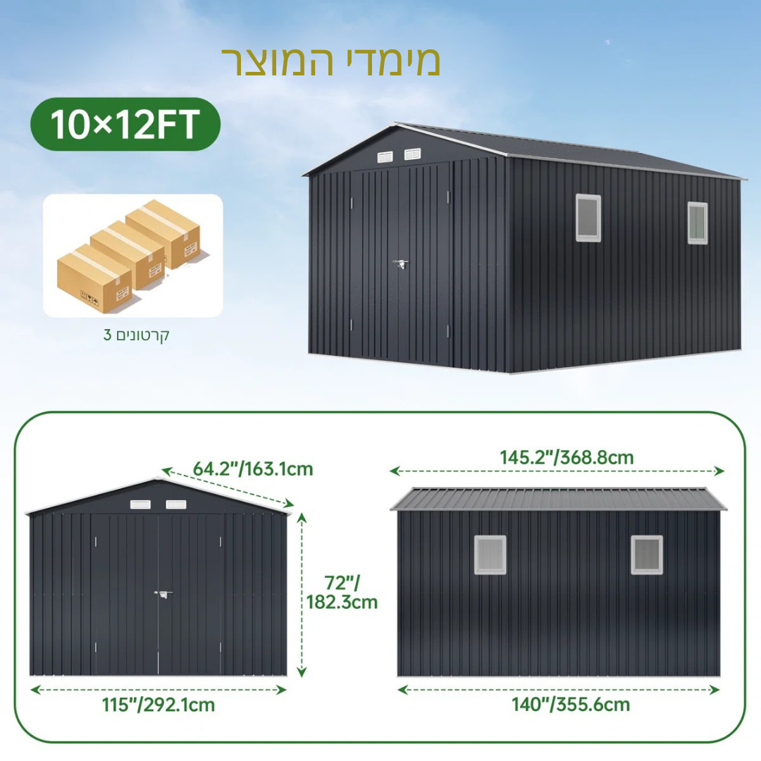 ™Nolira | מחסן מתכת בגודל 10x12 רגל עם חלונות – שלדת פלדה, גג משופע, מבנה עמיד למזג אוויר